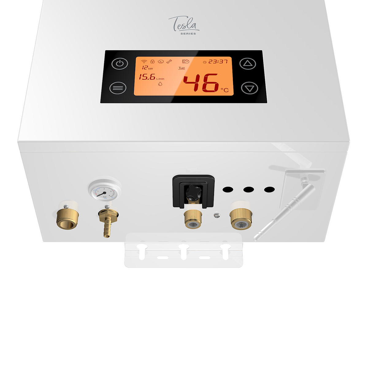 - 3 в 1: регулируемая мощность. В серии можно выставить и ограничить максимальную мощность, выбрав 6, 9 или 12 киловатт. Площадь отопления в Tesla до 120 квадратных метров, а за счет компактных размеров котел отлично вписывается даже в небольшие котельные. Возможность ограничения максимальной мощности помогает адаптировать работу котла под свои условия. Подключение котла возможно как однофазно, так и трехфазно, что также упрощает установку и эксплуатацию оборудования.