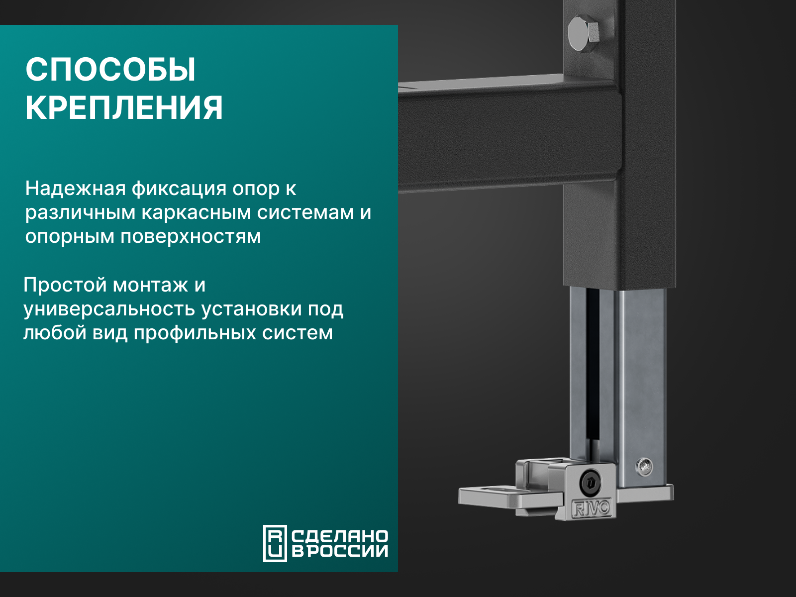- Надежная фиксация опор к различным каркасным системам и опорным поверхностям.