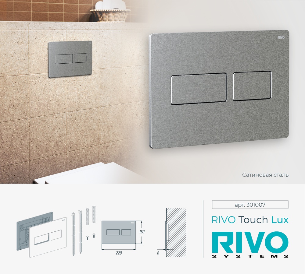 Панели двойного смыва RIVO Touch изготовлены из высококачественных и износостойких материалов, имеют классический дизайн, позволяющий реализовывать элегантные проекты ванных комнат и помещений санитарно-технического назначения. На производстве RIVO акцентируется внимание на качестве защитно-декоративных покрытий.