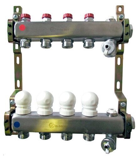 Коллектор TESA в сборе для радиаторного отопления 1" 4 выхода 3/4" Евроконус нержавеющая сталь