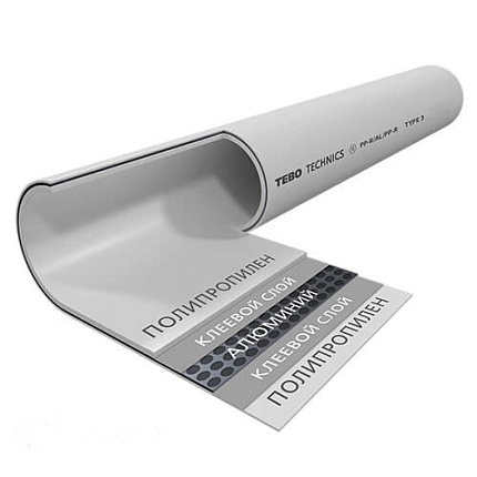 Труба полипропиленовая TEBO SDR 6, армирование алюминием снаружи устанавливается на автономное отопление, горячее водоснабжение и холодный водопровод. Армирование алюминиевой фольгой защищает трубу от выгибания и не пропускает большую часть кислорода внутрь системы отопления.