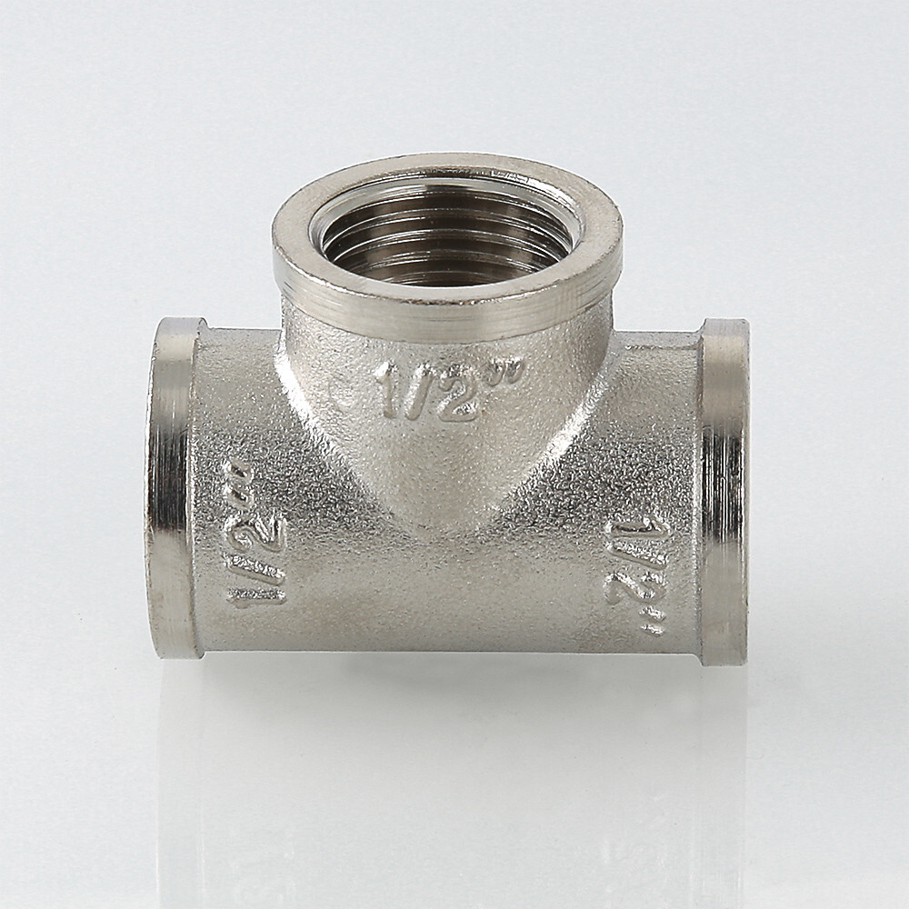 (VTr.130.N) Латунный никелированный трехсторонний фитинг, равнопроходной. Резьба – внутренняя, цилиндрическая трубная по ГОСТу 6357 (ISO 228, EN 10226), совместимая также с наружной конической трубной резьбой по ГОСТу 6211 (ISO R7).