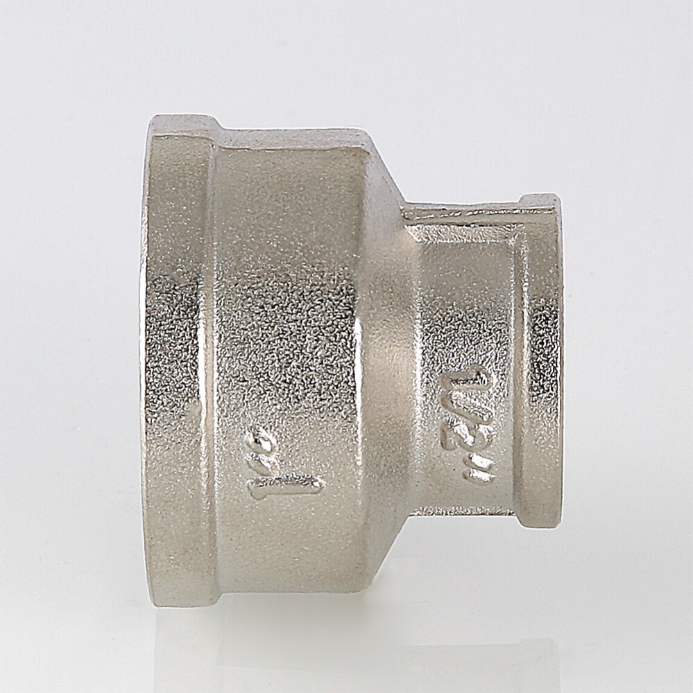 (VTr.240.N) Латунная никелированная муфта для перехода с одного диаметра трубы на другой. Резьба – внутренняя/внутренняя, цилиндрическая трубная по ГОСТу 6357 (ISO 228, EN 10226), совместима также с наружной конической трубной резьбой по ГОСТу 6211 (ISO R7).