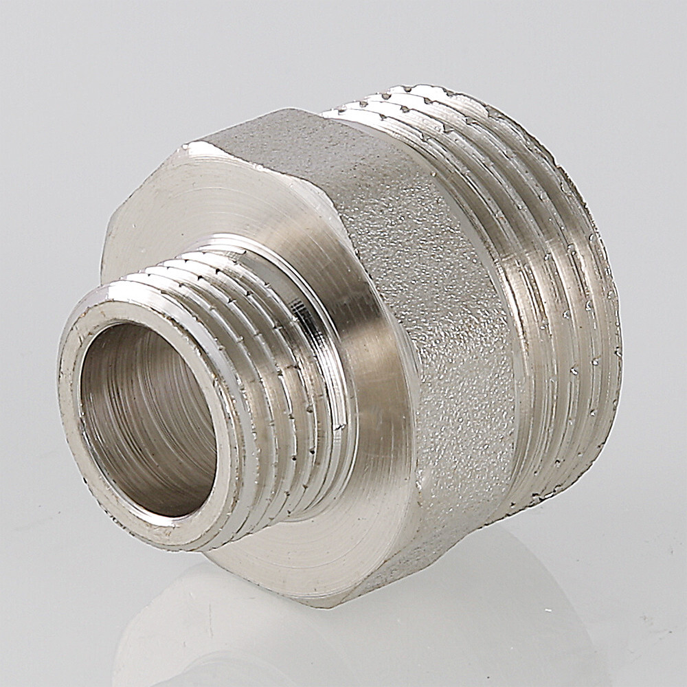 (VTr.580.N) Резьбовой фитинг – ниппель переходной. Обеспечивает соединение элементов трубопровода разного диаметра. Выполнен из латуни CW617N (евростандарт EN12165) горячим штампованием с последующим никелированием. Резьба обоих патрубков – наружная (тип – цилиндрическая трубная, ГОСТ 6357, ISO 228, EN10226). Насечки на резьбе способствуют удержанию герметизирующего материала (например, сантехнического льна). Наличие шестигранного (под гаечный ключ) участка корпуса облегчает монтаж соединения. Максимальная температура использования ниппеля составляет 250 °С (при максимальном рабочем давлении 2,7/1,7 МПа – для моделей условным диаметром до/более 1”).