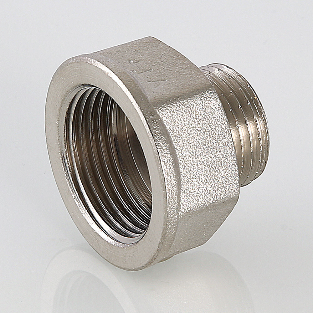 (VTr.592.N) Назначение фитинга – переход с внутренней резьбы на наружную (больший/меньший диаметр). Переходник изготовлен горячим штампованием из латуни CW617N с последующим никелированием. Корпус фитинга – шестигранный – под гаечный ключ. Резьба – трубная цилиндрическая, совместимая с наружной конической по ГОСТу 6211. Номинальное давление – 40/25 бар (для типоразмеров до/более 1”). Максимальное рабочее давление при температуре среды 250 °С – 2,7/1,7 бара. Переходник применим на стальных, медных, латунных, пластиковых, металлопластиковых трубопроводах.