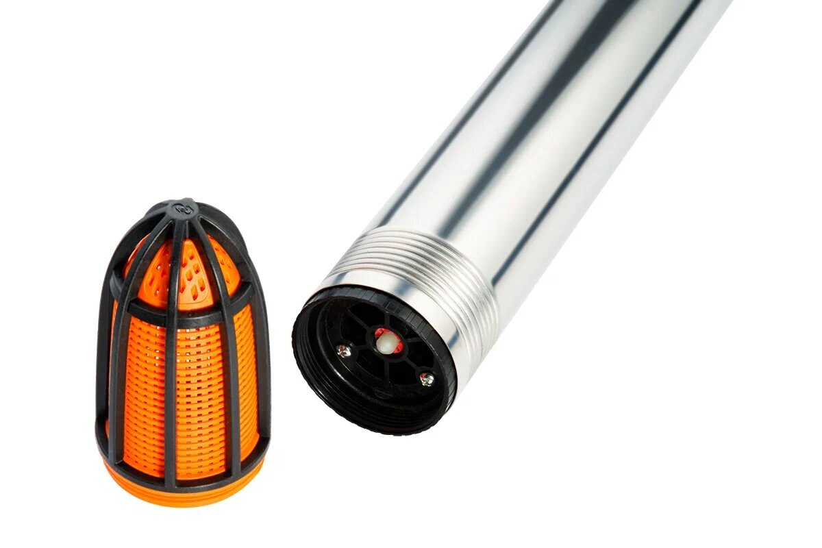 - Внешний съёмный фильтр предотвращает попадание грязи и песка. В случае загрязнения достаточно промыть фильтрующую сетку. Фильтр не случайно имеет форму конуса. Такая конструкция значительно облегчает процесс опускания насоса в скважину при «ступенчатом» соединении обсадных труб.