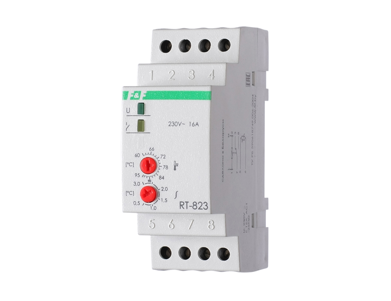 RT-823 – электронный терморегулятор для установки в щиток на профиль DIN с диапазоном регулирования температуры от +60 до +95 °C.