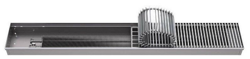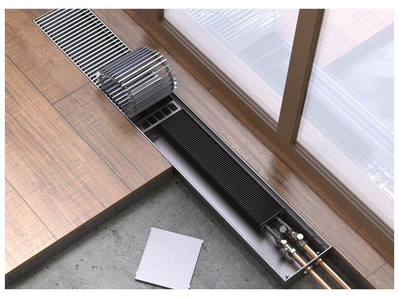 Конвекторы встраиваются в структуру пола, оставляя видимой лишь декоративную решетку из анодированного алюминиевого профиля, полированной нержавеющей стали или ценных пород дерева, которая образует с полом единый дизайн - элемент.